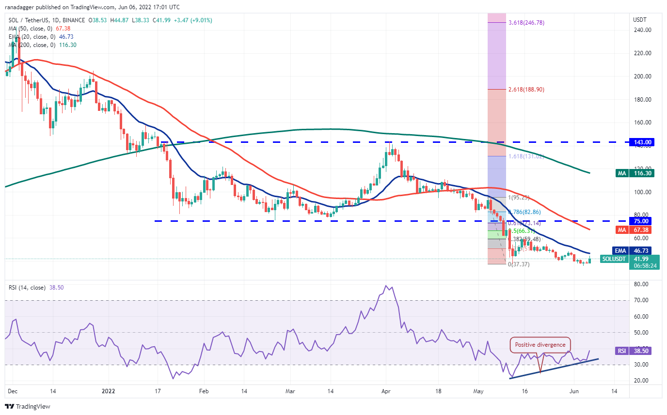 Solana (SOL) se desplomó por debajo del soporte crítico de USD 37 el 4 de junio, pero un aspecto positivo menor es que los alcistas compraron en niveles más bajos. Esto puede haber tomado por sorpresa a los agresivos bajistas, lo que resultó en una fuerte recuperación como se ve en la larga cola de la vela del día.