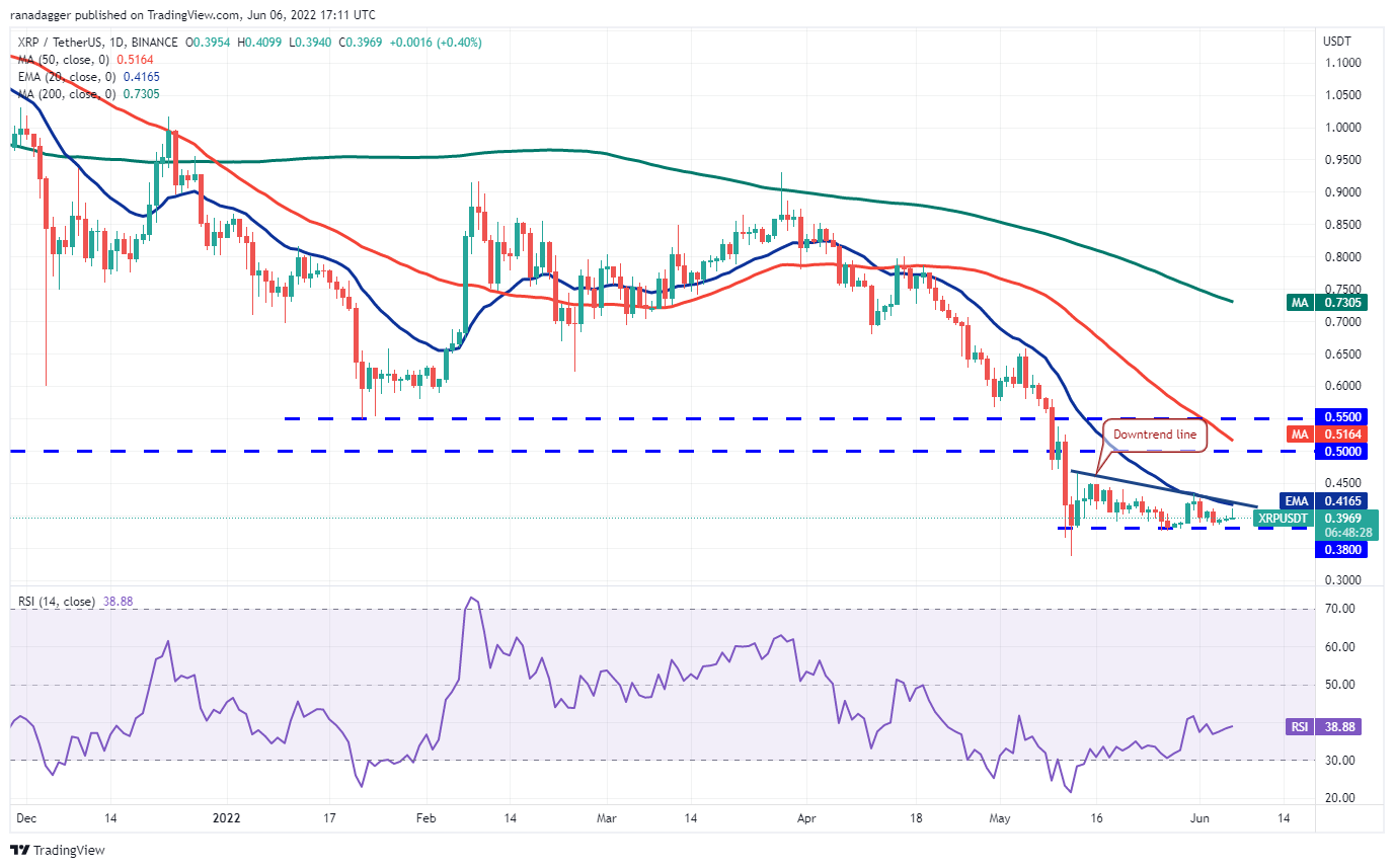 Ripple (XRP) ha estado operando dentro de un patrón de triángulo descendente bajista. Los alcistas intentan empujar el precio por encima de la línea de tendencia bajista, pero los bajistas plantean un fuerte desafío, como se ve desde la mecha larga de la vela del día.