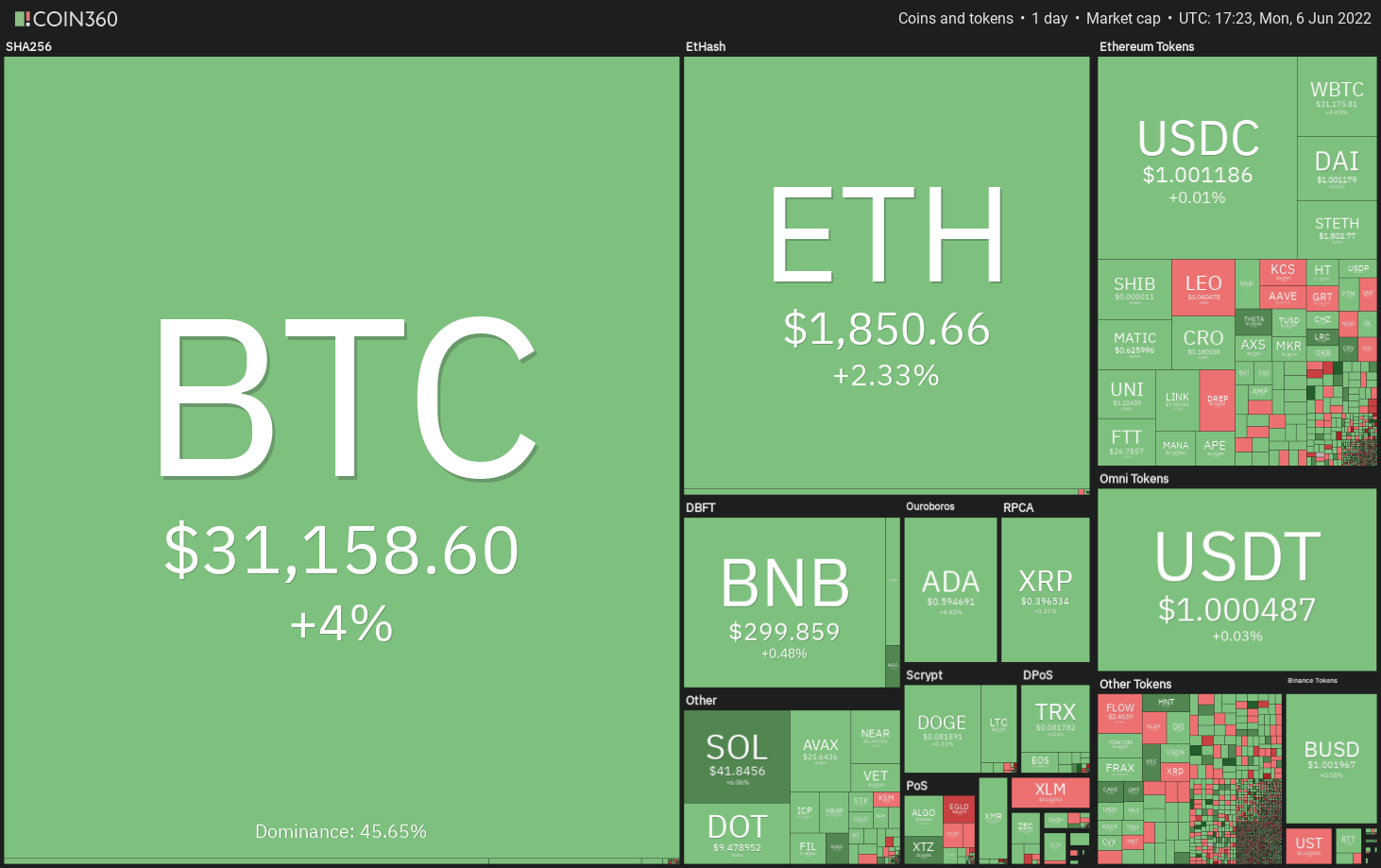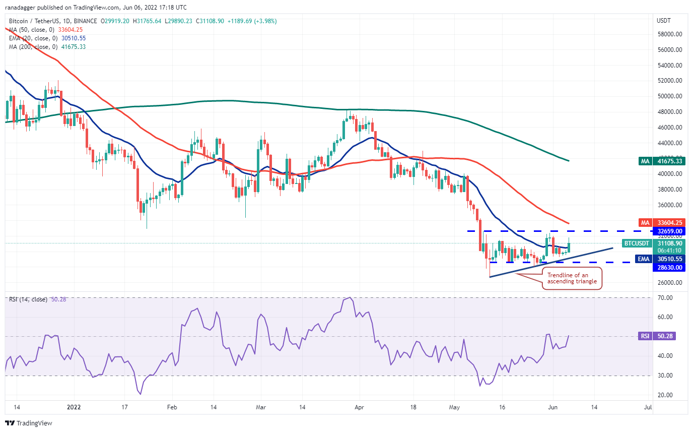 Después de dos días de rango pequeño el 4 y 5 de junio, el rango se expandió el 6 de junio y Bitcoin se disparó por encima del promedio móvil exponencial de 20 días (E (USD 30,510). Los alcistas están tratando de empujar el precio a la resistencia superior en USD 32,659.