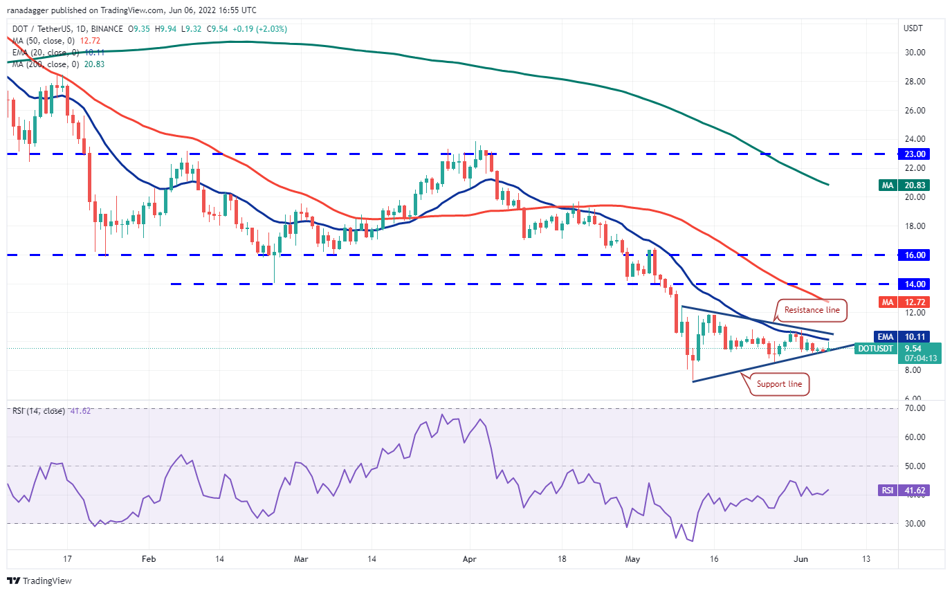 Polkadot (DOT) ha formado un triángulo simétrico, que normalmente actúa como un patrón de continuación. Los compradores están intentando empujar el precio por encima de la EMA de 20 días (USD 10) y desafiar la línea de resistencia del triángulo.