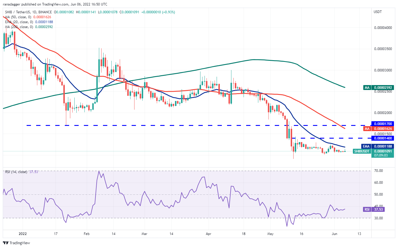 Los compradores han defendido con éxito el soporte de USD 0,000010 durante los últimos días, pero no han podido empujar a Shiba Inu (SHIB) por encima de la EMA de 20 días (USD 0.000012). Esto sugiere que la compra se agota en los niveles más altos.