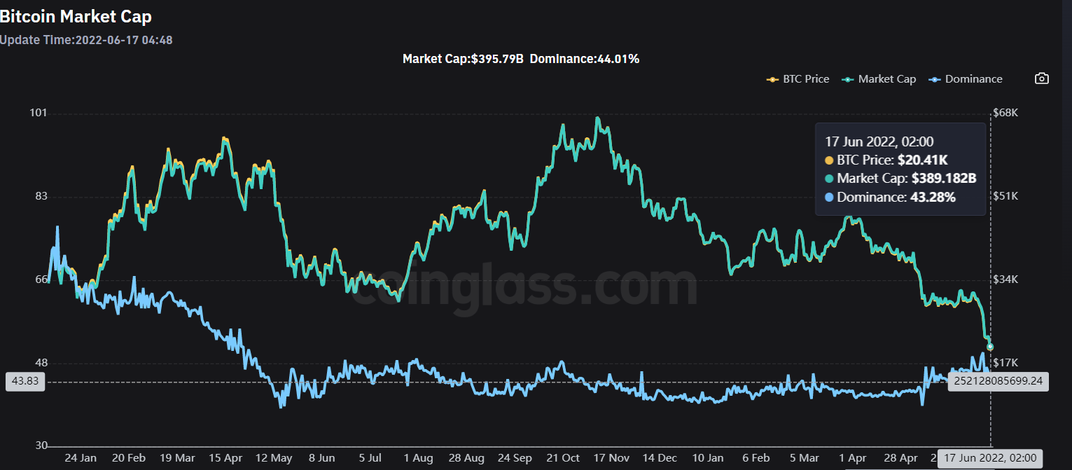 Desde seu pico em novembro, o valor de mercado do Bitcoin perdeu mais de dois terços de seu valor, caindo de US$ 1,22 trilhão para US$ 389 bilhões em 17 de junho de 2022.