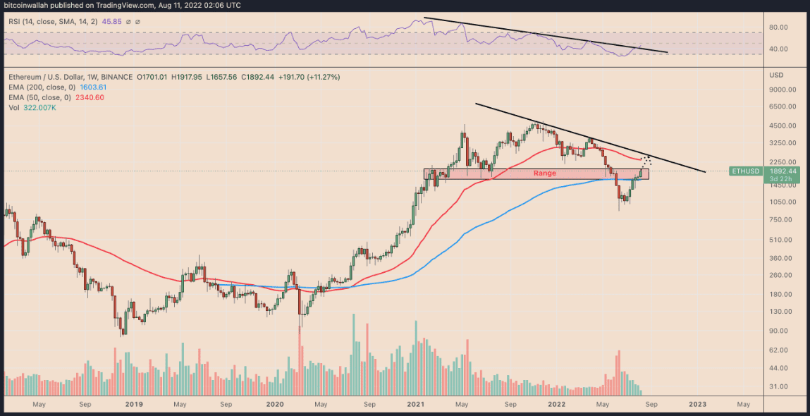 “Seu alvo de alta mais próximo é a média móvel exponencial de 50 semanas em US$ 2.340 (R$ 12.050). O próximo alvo de quebra de intervalo pode estar na resistência da linha de tendência descendente de vários meses do Ether (a linha preta) em cerca de US$ 2.500 (cerca de R$ 13.000)”, disse.