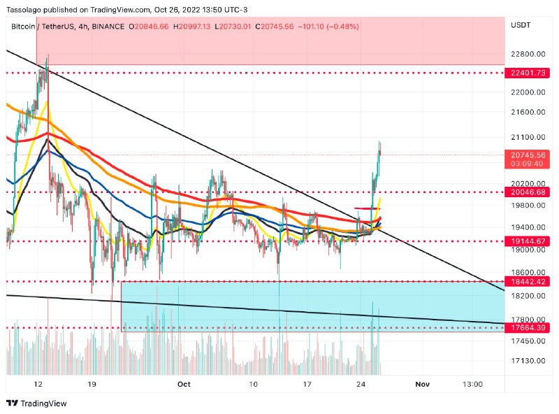 "Conforme salientamos em nossas últimas análises, estávamos esperando a confirmação desse rompimento para que o mercado animasse um pouco...e animou. No geral, vemos que o Bitcoin pode ir em direção aos U$22.000, porém ainda não temos uma reversão de tendência. Ao olharmos pelo gráfico semanal, temos uma barreira nos U$22.400 aproximadamente, composta pela EMA 20. Posteriormente temos as EMA+MA 200 até a região dos U$25000 praticamente, que atuará como forte barreira", destaca.