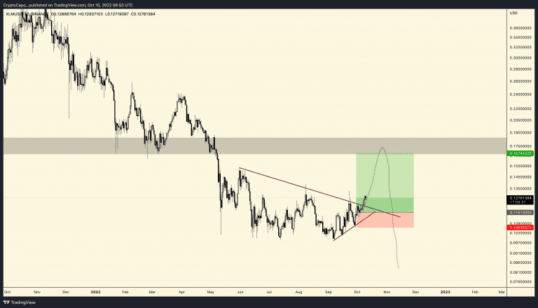 A primeira criptomoeda na lista de Capo é a XLM, criptomoeda projetado para atuar como uma ponte entre duas moedas fiduciárias ao enviar dinheiro para o exterior. De acordo com o analista, ele vê a XLM registrando uma alta de 31,25% frente ao seu preço atual, atingindo a região de US$ 0,167.