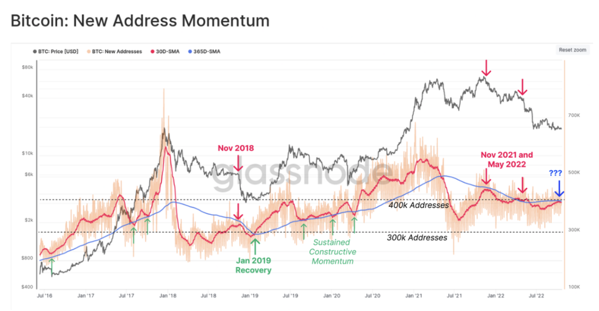 Novos endereços dentro do ecossistema Bitcoin que possuem um endereço diferente de zero também se estabilizaram, uma tendência que também ocorreu em novembro de 2018. O crescimento estagnado em novos endereços diferentes de zero em 2018, foi seguido por uma queda de preço do BTC e não se recuperou até janeiro de 2019, quando essa métrica começou a aumentar.