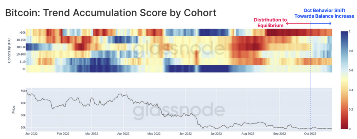 Apesar da queda dos preços do BTC, muitas baleias BTC que detêm um excesso de 10.000 BTC estão possivelmente aumentando suas participações mesmo em condições de mercado em baixa. Conforme mostrado no gráfico abaixo, eles continuam acumulando BTC após a distribuição em abril e setembro.