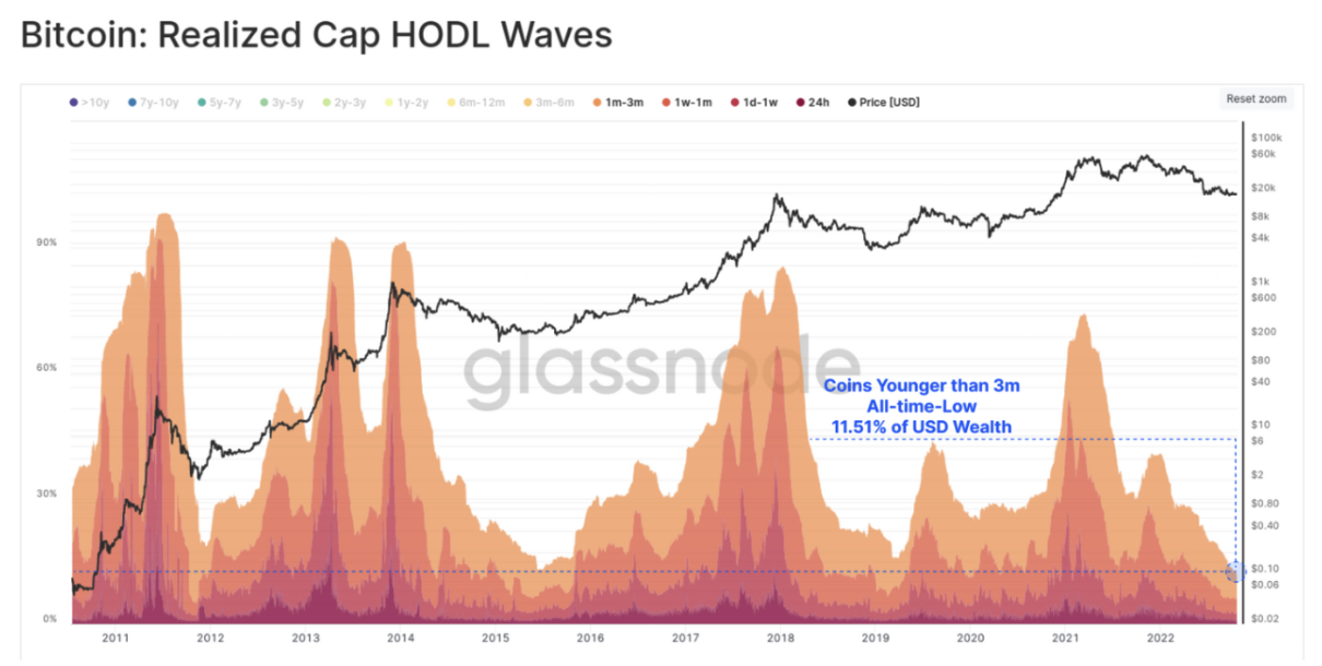 De acordo com a métrica Realized Cap HODL Waves, a riqueza total em USD mantida em BTC, avaliada no momento da última transação de cada moeda, agora está desproporcionalmente desviada para os detentores de longo prazo. A proporção de riqueza mantida em moedas que se moveu nos últimos 3 meses está agora no nível mais baixo de todos os tempos. A observação recíproca é que a riqueza detida por moedas com mais de 3 meses (cada vez mais detidas por Hodlers) está agora em seu nível mais alto.