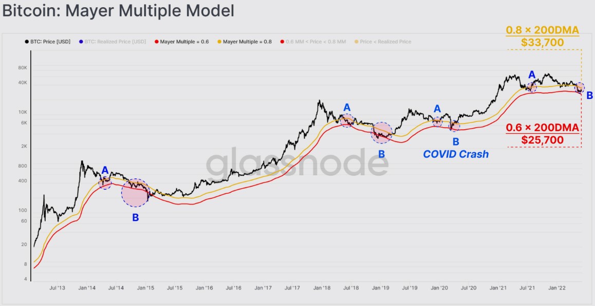 En mercados bajistas previos, "las condiciones de sobreventa o infravaloración han coincidido con la caída del Múltiplo de Mayer en el rango de 0.6-0.8", según Glassnode, y ese es precisamente el rango en el que Bitcoin se encuentra actualmente.