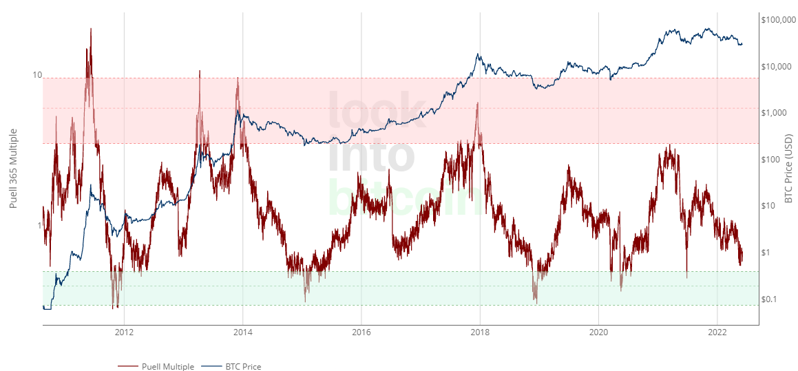 En caso de que el precio de BTC siga bajando desde este punto, no es descartable que aumente la capitulación de los mineros, como ha demostrado en el pasado el Múltiplo de Puell, que es la relación entre el valor de emisión diario de Bitcoin y la media móvil de 365 días de este valor.