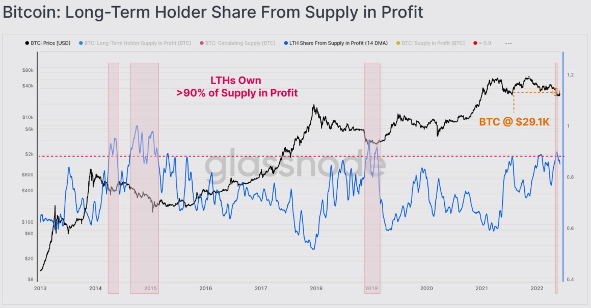 La reciente caída por debajo de los USD 30,000 para Bitcoin hizo que el porcentaje del suministro en ganancias se disparara por encima del 90% para la cohorte de holders a largo plazo, lo que sugiere que los tenedores a corto plazo han "alcanzado esencialmente un umbral de dolor casi máximo".