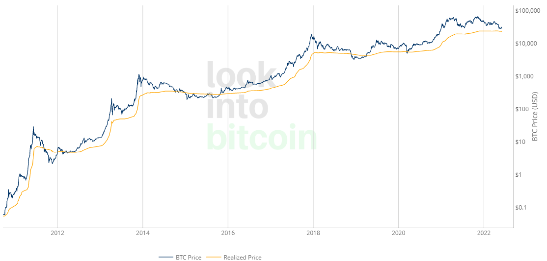 El modelo de precios realizados de Bitcoin también ofrece una visión de lo que podría ser un precio mínimo para BTC, con la lectura actual proporcionada por el proveedor de datos LookIntoBitcoin que sugiere que el precio realizado de BTC es de USD 23,601 al de 5 de junio.