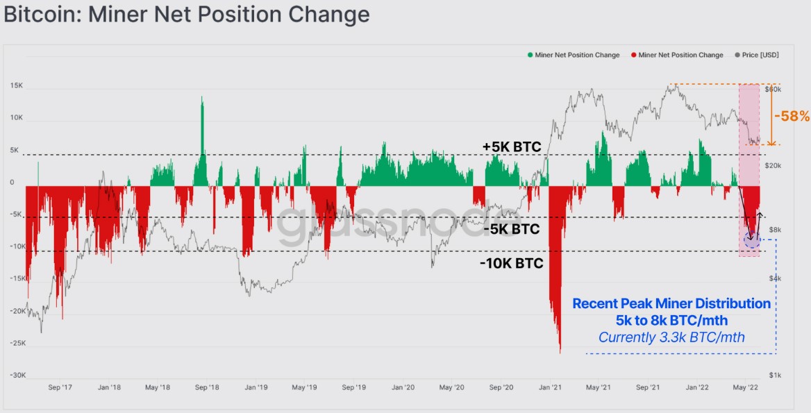 Según Glassnode, los mineros también han sido vendedores netos en los últimos meses, pues el descenso del BTC ha dificultado la rentabilidad de la minería de BTC, lo que ha provocado "una reducción agregada del saldo de los mineros de entre 5,000 y 8,000 bitcoins al mes".