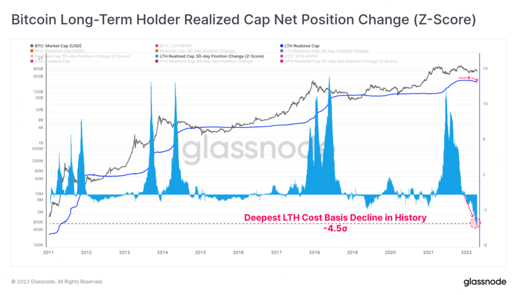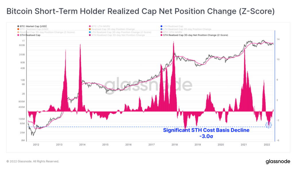 Столь серьезное падение чистой реализованной капитализации, приходящейся на краткосрочных инвесторов (три средних квадратических отклонения), наблюдалось лишь дважды — на экстремумах медвежьего рынка 2018 года. Текущая динамика превзошла коррекцию в июле 2021 года.
