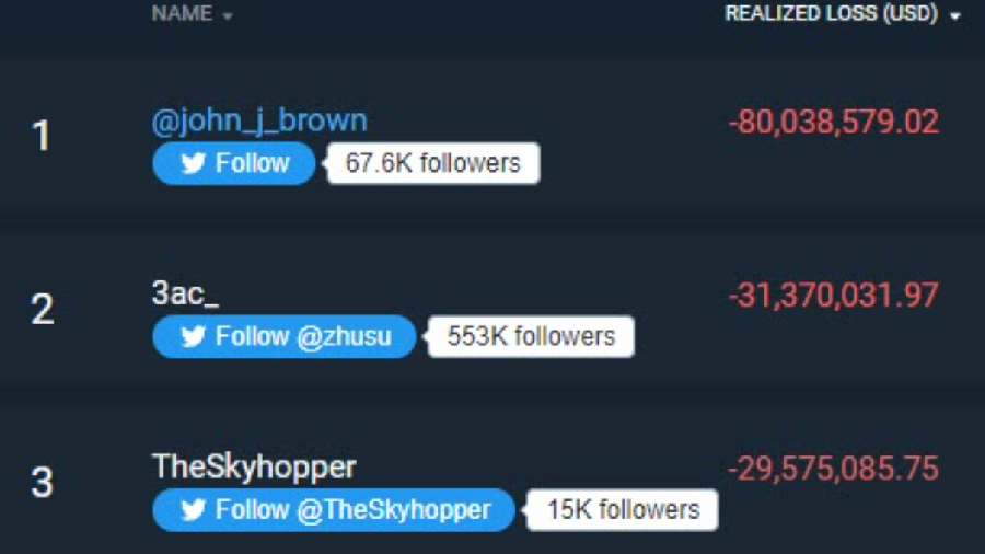 Инвестор и криптовалютный трейдер под псевдонимом Moon привел в Twitter данные о том, что Three Arrows Capital занял 2-е место в таблице лидеров на Bitfinex по реализованным убыткам в мае 2022 года с -$31 млн.