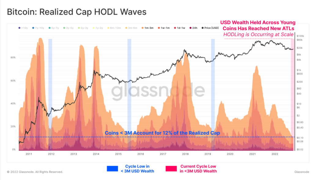 По метрике HODL Waves на базе реализованной капитализации эксперты зафиксировали рекордно низкий уровень монет в распоряжении спекулянтов (с горизонтом менее трех месяцев).