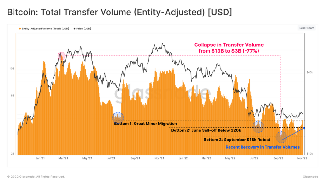 Схожие обнадеживающие сигналы сформировались по метрике суточного объема переданной ончейн-стоимости в долларовом выражении. После пика в $13 млрд в мае 2021 года показатель упал на 77% к сентябрю 2022 года и в настоящее время остается в диапазоне $3-4 млрд.
