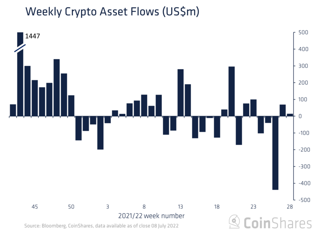 За 2-8 июля приток средств в криптовалютные инвестиционные продукты составил $15 млн. Согласно CoinShares, темпы поступлений в фонды, которые позволяют открывать шорты по биткоину, замедлились с $51 млн неделей ранее до $6,3 млн.