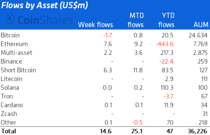 По расчетам аналитиков, AUM криптопродуктов по индустрии в целом отскочил от годового минимума в $35,41 млрд, составив $36,23 млрд.