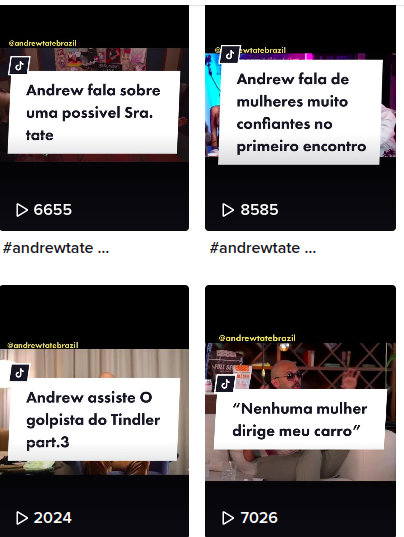 Um canal no TikTok chamado AndrewTateBrazil se dedica a pegar “cortes” famosos do influencer e colocar legendas em português. Mas o alcance ainda é tímido perto do que se vê nos EUA e Reino Unido: o canal tem 2711 seguidores e 28,8 mil curtidas.