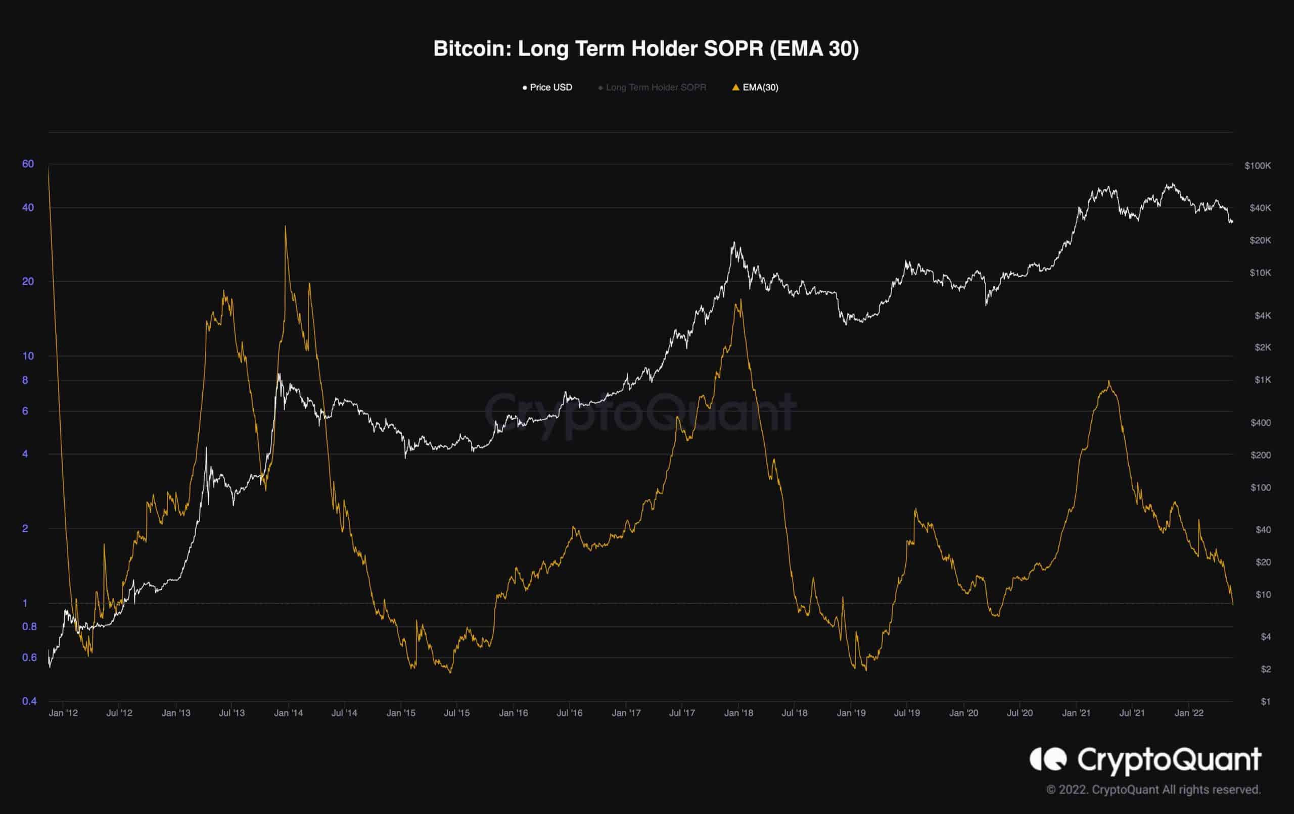 This chart consists of the 30-day exponential moving average of the Long-Term Holder SOPR and Bitcoin’s price. Historically, the LTH-SOPR shows values below one at the end of the bear market, usually when a capitulation event has occurred. Then, the big players also start to move their coins in a total loss which can be interpreted as selling pressure under fear and doubt (capitulation).